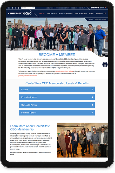 A powerhouse in economic development in Central New York, CenterState CEO is a non-profit organization comprised of hundreds of business- members across the region. No surprise then that it stands as a critical information hub for the region, enabled by a hard-working website that communicates with members and serves as the ‘go to’ source for other stakeholders such as site-search professionals, municipalities, venture capitalists, journalists, among many other audiences.